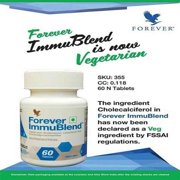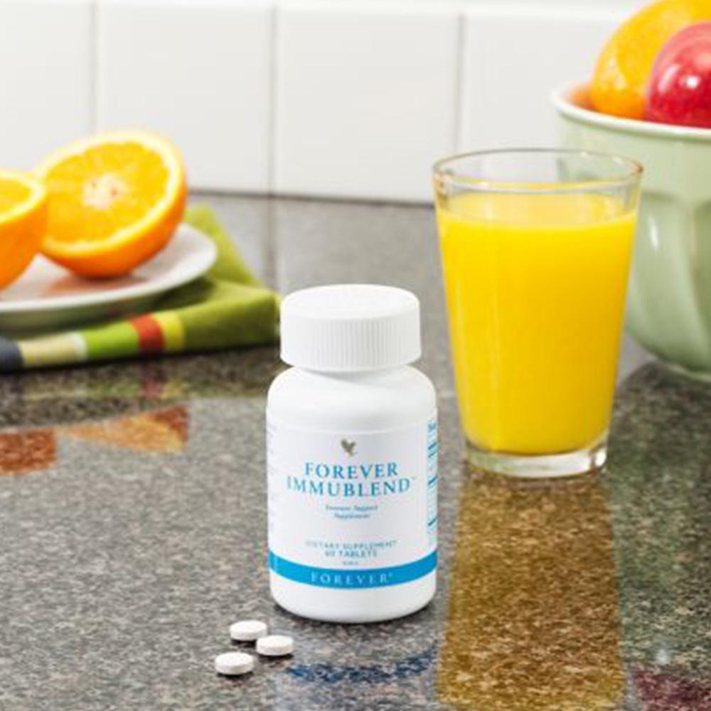 مکمل ایموبلند فوراور Forever Immublend تقویت سیستم ایمنی بدن، دارای ویژگی های FOS (fructooligosaccharides)، لاکتوفرین، maitake و قارچ، ویتامین D، C و روی است.